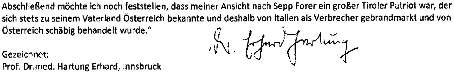 „Als etwa 20-jähriger Medizinstudent lernte ich den Südtiroler Freiheitskämpfer Sepp Forer über viele Tage erstmals persönlich kennen, da er von meiner Mutter, Frau Dr. Gerda Foltin geb. von Hartungen, in ihrer Innsbrucker Wohnung in der Erzherzog Eugenstrasse 17 Quartier und Verpflegung erhielt. Dies deshalb, da er wegen seiner politisch verursachten Aktivitäten im Südtiroler Freiheitskampf sowohl in Italien als auch in Österreich (erstmalige Verhaftung im Februar 1963) von staatlicher Seite verfolgt wurde. Meine Mutter stand mit den Freiheitskämpfern Dr. Heuberger und Dr. Klier bereits in Kontakt.